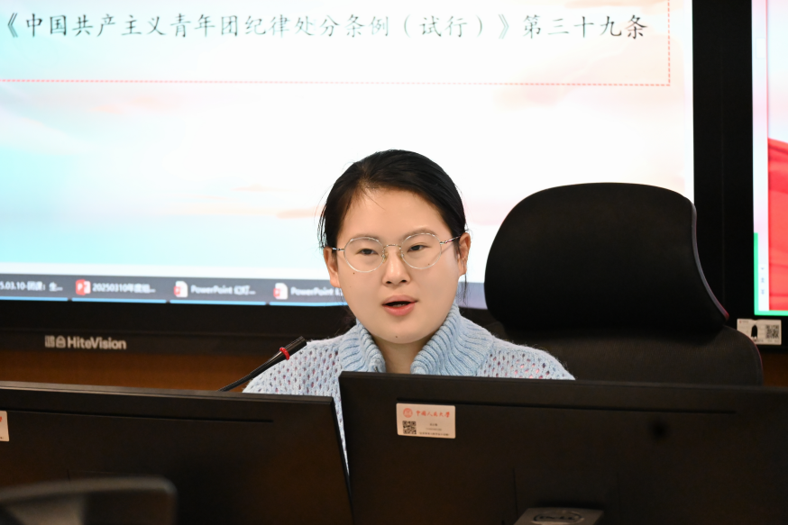 团支部副书记陈文琪组织全体团员进行团纪学习,围绕核心要义展开领学。团纪律是团的各级组织和全体团员必须遵守的行为规则,是维护团在党领导下的团结统一、完成党赋予的职责使命的保证。广大团员要主动学习团规团纪,养成纪律自觉,在思想上划出红线,在行为上明确界限,做崇德向善、严格遵纪守法的模范,带头明大德、守公德、严私德,严格遵纪守法,严格履行团员义务,切实在广大青年中树立起共青团员的良好形象。