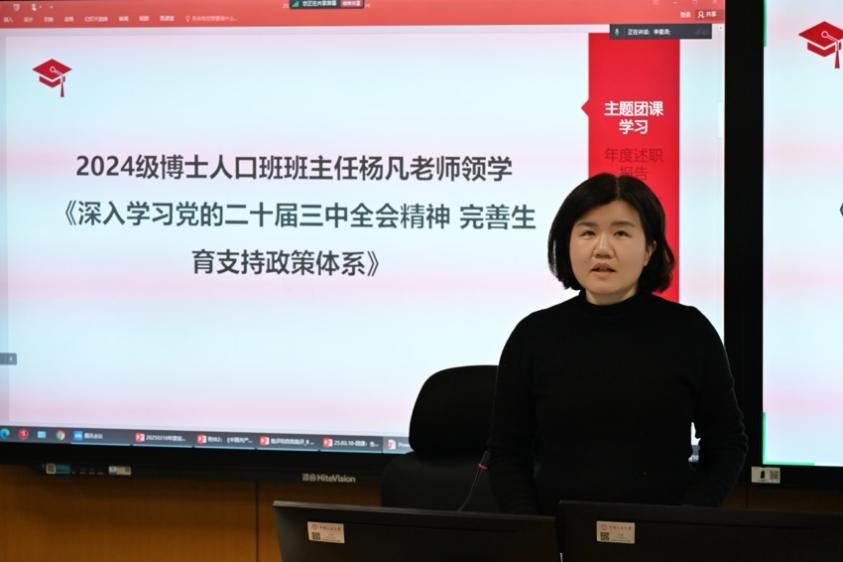 会议伊始,班主任杨凡教授以《深入学习党的二十届三中全会精神 完善生育支持政策体系》为题,从“政策体系、建设状况、存在不足、如何完善”四大维度领学并深度阐释全会精神。她指出,人口高质量发展战略与生育支持政策创新,其根本目标在于践行“以人民为中心”的核心理念,生育友好型社会、人口高质量发展,最终指向是坚持以人民为中心、让现代化成果惠及全体人民。