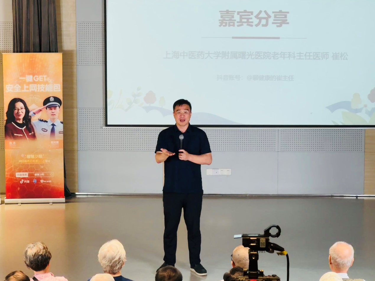 针对老年人容易轻信养生谣言、冲动购买各类保健品的问题,抖音创作者、上海中医药大学附属曙光医院老年科主任医师崔松走进课程上海站,分享科学养生知识。崔松劝导老年人要理性、克制地购买和服用保健食品,购买时要认准国家保健食品认证标识——“小蓝帽”。他还指出当下人们就医的“怪现象”:“医生最怕两个‘人’,一个叫‘度娘’(某网络搜索平台),另一个叫‘伊拉’(上海话,他们),很多老年人来看病时,都爱带着‘伊拉’,‘伊拉’说我这个病应该吃什么药……”崔松提醒,遇到健康问题相信医学,而非网络上的“祖传方”或“来自世界上某一神秘地域的神药”。