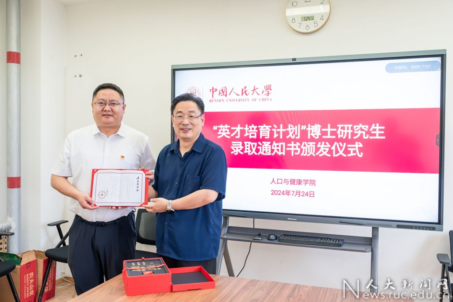 7月24日下午,第一版主 常务副校长朱信凯向第一版主 2024级博士研究生丁爱国送去录取通知书。